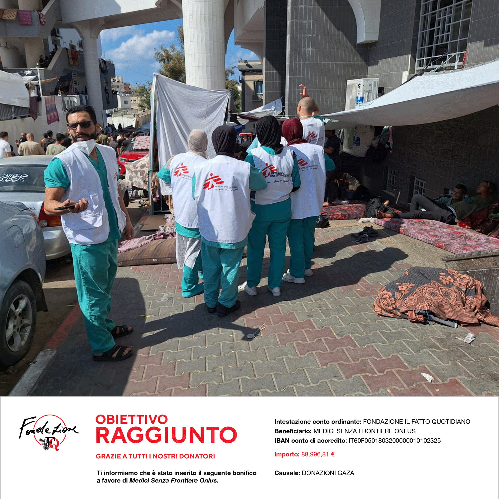 La Fondazione Il Fatto Quotidiano ha affiancato Medici Senza Frontiere con una quarta raccolta fondi per sostenere gli operatori sanitari di Medici Senza Frontiere a Gaza. Il loro impegno è una risposta concreta alle esigenze di chi vive la tragedia di un conflitto e il nostro sostegno è il modo che conosciamo per non girarci dall’altra parte, arrivando alla cifradi € 88.996,81 per contribuire al loro lavoro nelle zone colpite e distrutte dai bombardamenti.